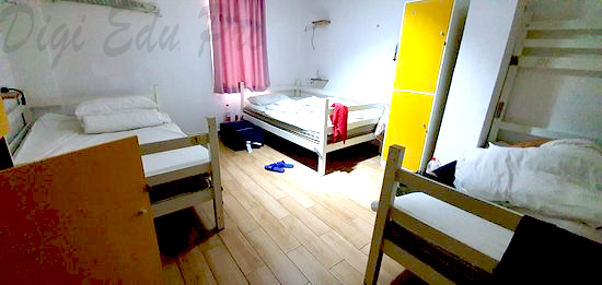 A room for six students with a bathroom (a washing machine, a telephone, a watering trough, beds, bureau for share, tables, desks, and so on)